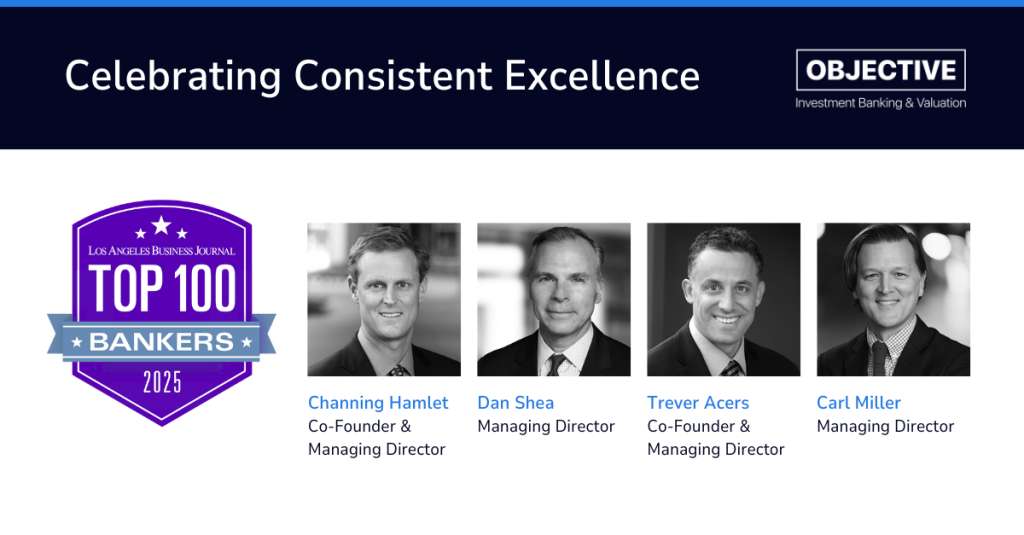 Los Angeles, CA – Objective, Investment Banking & Valuation (“Objective”) is proud to share that four of our Managing Directors have been recognized by the Los Angeles Business Journal in its inaugural Top 100 Bankers list. Channing Hamlet, Dan Shea, Trever Acers, and Carl Miller were selected for their leadership in the financial advisory space […]