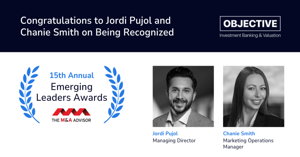 The M&A Advisor announced Jordi Pujol, Managing Director and Chanie Smith, Marketing Operations Manager, of Objective Investment Banking and Valuation are recipients of the 15th Annual Emerging Leaders Award.