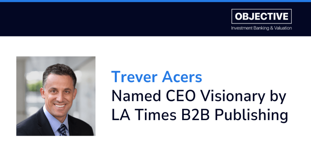 Los Angeles, CA – Objective, Investment Banking & Valuation, proudly announces the recognition of Trever Acers as 2024 CEO Visionary by L.A. Times B2B Publishing’s C-Suite Magazine. This esteemed accolade celebrates their exceptional contributions and remarkable achievements over the past 24 months. Click here to read the magazine.